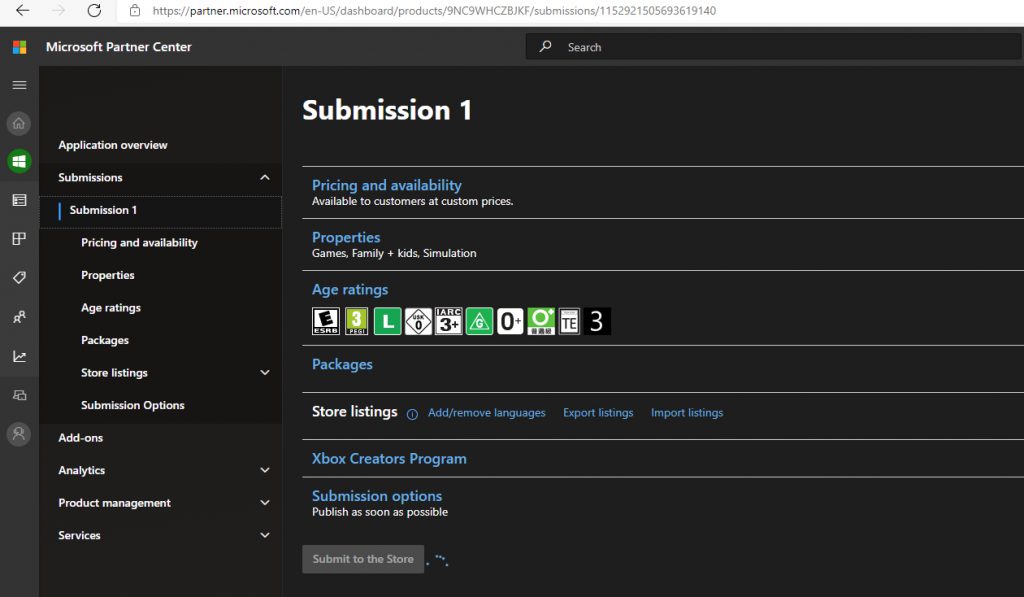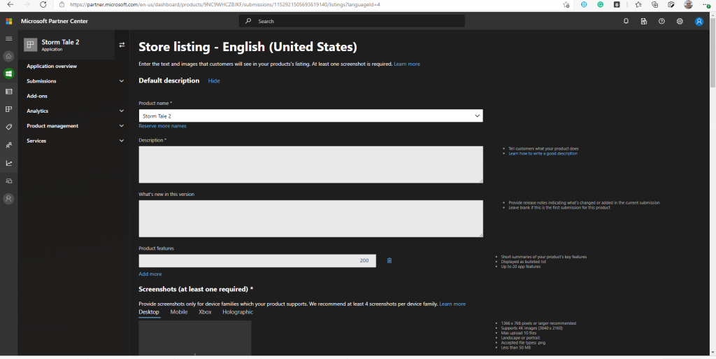 In store listings, this is where we put all the information about our game, description, trailers and screenshots, as it will appear in the Store. The Microsoft Store supports multiple languages, and you have the option to create a different page for each language if you wish.