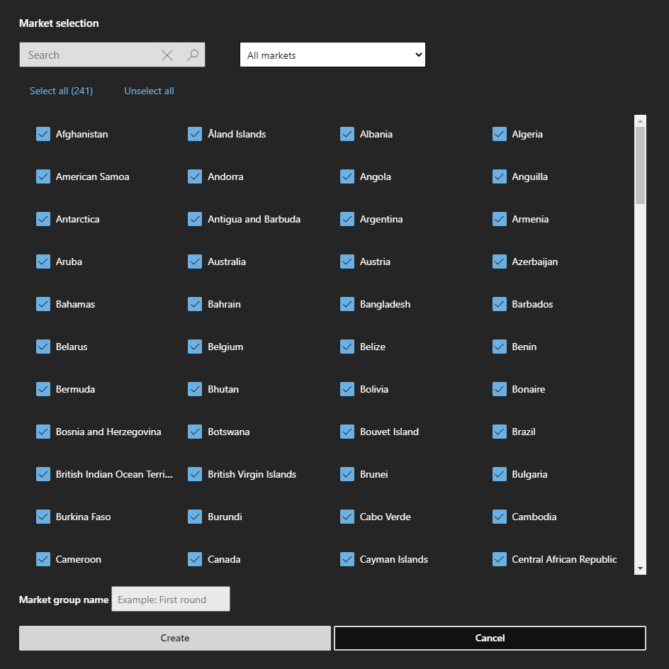 Most importantly now, Prices. The Microsoft Store accepts as many Free games with In-App Purchases as Paid games. You define this by choosing the base price, and then click on “SELECT MARKETS TO REPLACE THE BASE PRICE”, click on Select All and then on Create.