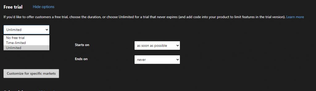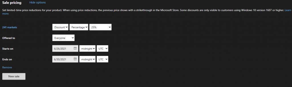 In “Sale Price” you can set limited time discounts for your game. This is a great way to advertise as discounted games are featured prominently on the Microsoft Store. You can define the type of discount, and how long it will be available.