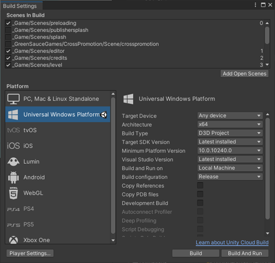 To test it, we first change the platform from "Debug Arm" to "Master X64", and in Solution Explorer, we right-click on the Game project and select "Set as Startup Project". The other 2 projects there (Unity Data and IL2CppOutputProject) are part of the build but cannot be run, so you need to select your game project. Then just click on the Play button where it says "Local Machine".