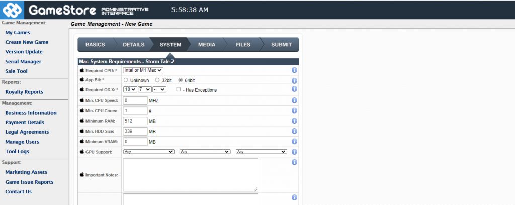 Sem DRM – Download Direto – Nenhum DRM será aplicado ao seu jogo e o comprador receberá o download direto para ele. MGS DRM – Sem Teste – O DRM da Mac Game Store será aplicado e o jogo não terá um Teste (versão Demo). MGS DRM – Teste de 60m – O DRM da Mac Game Store será aplicado e o jogo terá uma Trilha (Versão Demo), de 60 minutos. Após este período, o usuário precisará comprar para continuar jogando. Steam – Chaves Steam Fornecidas – Se o seu jogo estiver disponível no Steam, você pode vender Chaves Steam diretamente aqui, e o usuário ativará seu jogo no Steam após a compra. Você precisa fornecer um número de Chaves Steam que serão distribuídas aos compradores. DRM do Fornecedor – Se você tem seu próprio esquema de DRM, onde você tem um esquema Serial para registrar o jogo.