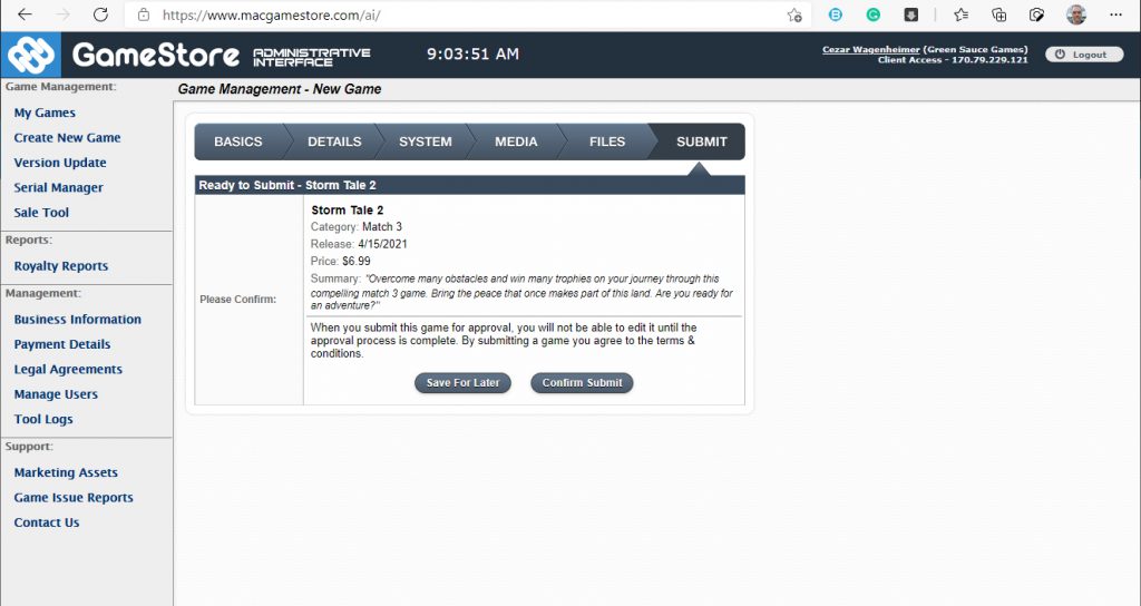 Finalmente, agora na aba final Enviar, basta confirmar os dados e clicar em Enviar. Ok, agora é só aguardar o processo de aprovação e seu jogo estará em breve na loja e disponível para compra! =)
