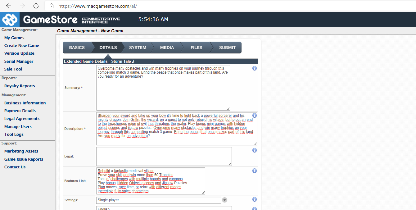 In the Details tab, we need to enter Summary, Description (a complete description of the game), and Features Lists (we list some of the game's outstanding features), Languages (Languages that the game supports).